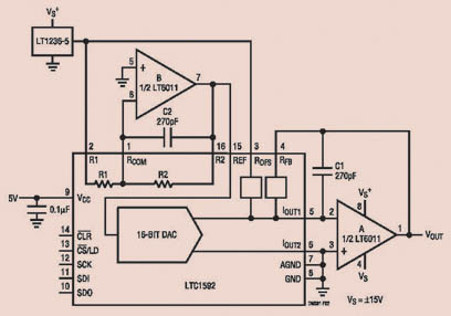 图2示出了配合使用LTC1592 16位DAC的LT6011被用作一个基准放大器和I至V转换器时的情形。虽然诸如LT1881和LT1469等速度较快的放大器也适合该DAC一道使用,但当功耗的重要性超过速度的重要性时,采用LT6011则更加理想。该应用的总电源电流可在1.6mA至4mA之间变化,而且几乎完全受控于DAC的电阻器和基准。 DAC本身仅由一个单DAC 5V电源来供电。LT6011运算放大器B采用DAC的内部精准电阻器R1和R2来使5V基准反相,这样便为DAC提供了一个负基准。从而实现了双极输出极性。运算放大器A负责提供I至V转换,并且对最终输出电压进行缓冲。I至V转换器功能电路所要求的精度是至关重要的,因为DAC输出电阻器网络与编码的高相关性是十分明显,所以,运算放大器所承受的噪声增益也与编码相关。在该功能电路中采用不精准的运算放大器有可能使其输入误差的放大与编码的关系出现一些混乱。 该电路的运行速度示于图3。可在250μs的时间里达到稳定状态。由于LT6011的输出摆幅在正负电源轨的40mV以内,因此,放大器的电源电压范围只需比期望的±10V输出稍宽即可。